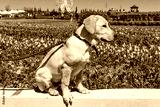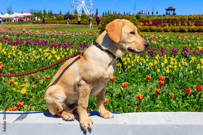 Portrait of a cute labrador retriever puppy next to blooming tulips flowers