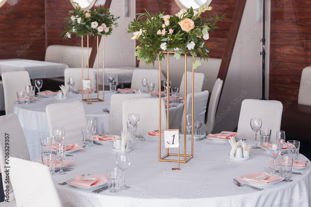 Table setting for a wedding banquet. Small restaurant hall. Round served tables