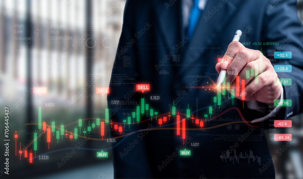 Data analysis charts, stock market trade and forex exchange rates, investment concepts, funds and finance, profit and growth charts. Hand holding pen touching virtual screen.