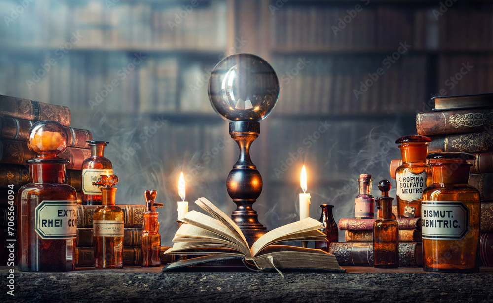 Alchemy, Halloween, magic, witchcraft, fortune telling, mysticism background. Magic crystal ball, ritual books and bottles of potion and poison.