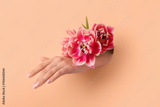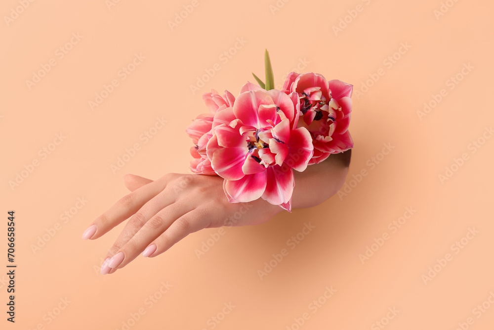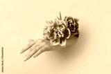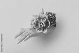Female hand with tulips visible through hole in nude paper