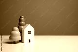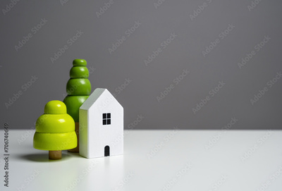 House with trees. Affordable housing. Buying a nice house. Garden work, landscape design. Figurine. Mortgage and loan.