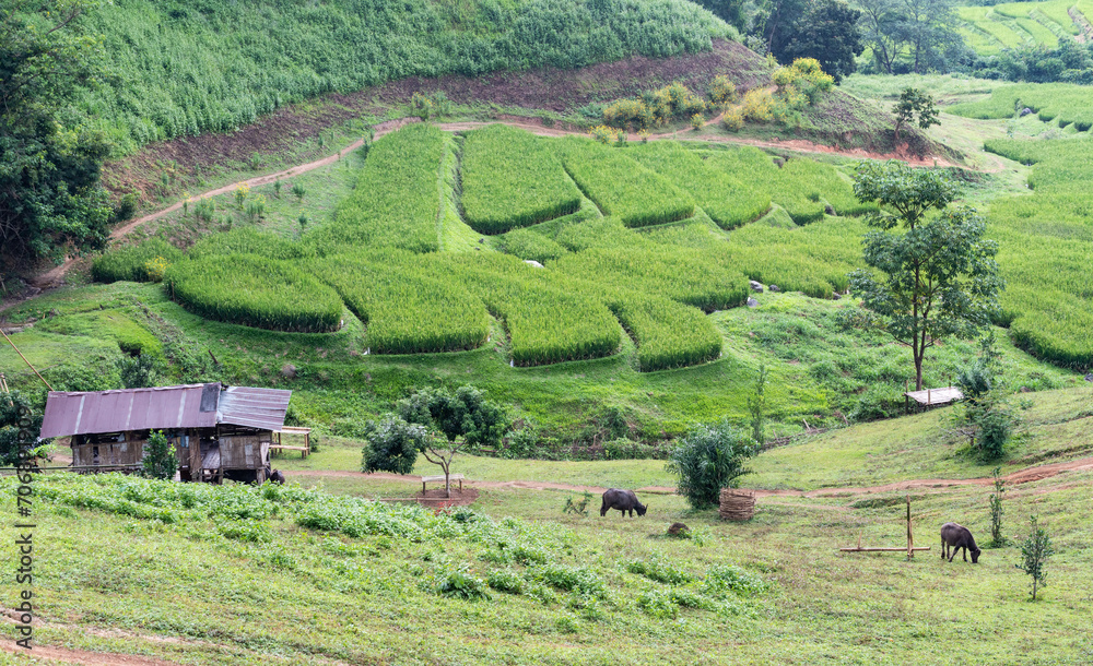 View of rice terraces in Ban Li Khai village in rural area of Chiang Rai province of Thailand.