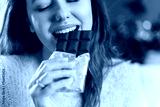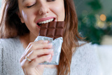 Happy young woman eating chocolate at home