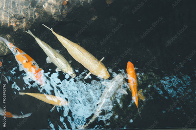 Beautiful koi carp fishes swimming in a freshwater aquarium tank in park, looking down