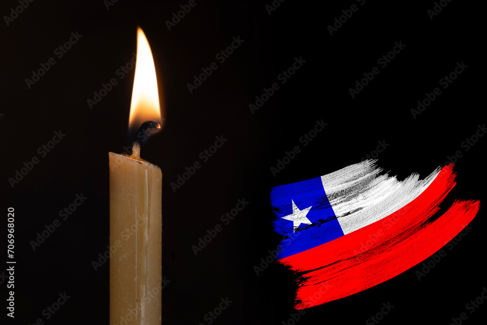 mourning candle burning front of flag Chile, memory of heroes served country, grief over loss, national unity in challenging times, state's history