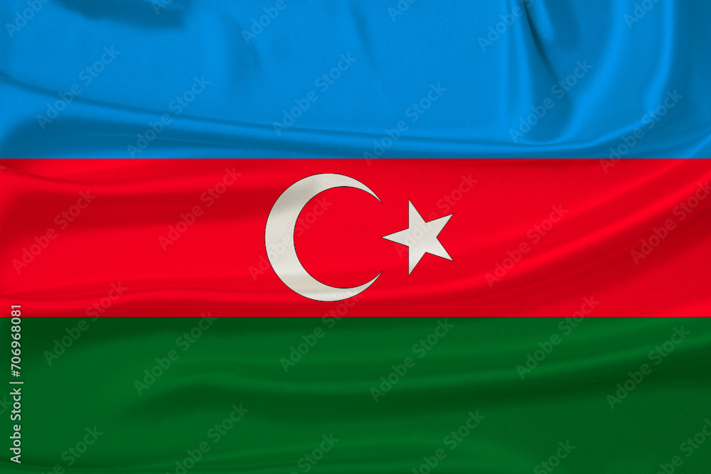 colored national flag represents Azerbaijan's sovereignty and independence as nation on textured fabric, concept unique cultural and political identity, tourism, emigration, economy and politics