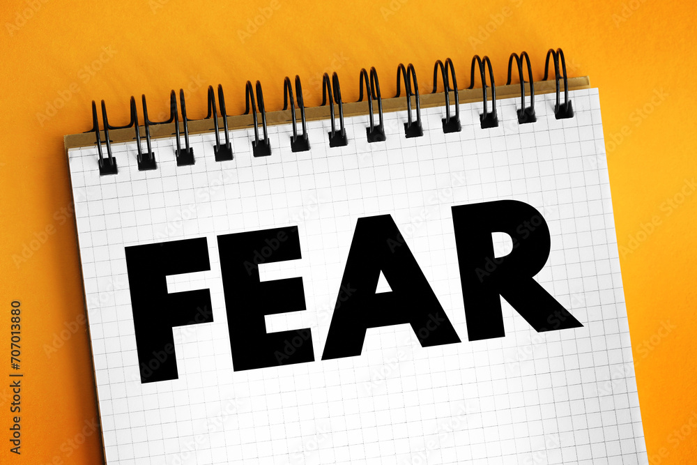 Fear is an intensely unpleasant emotion in response to perceiving or recognizing a danger or threat, text concept on notepad