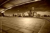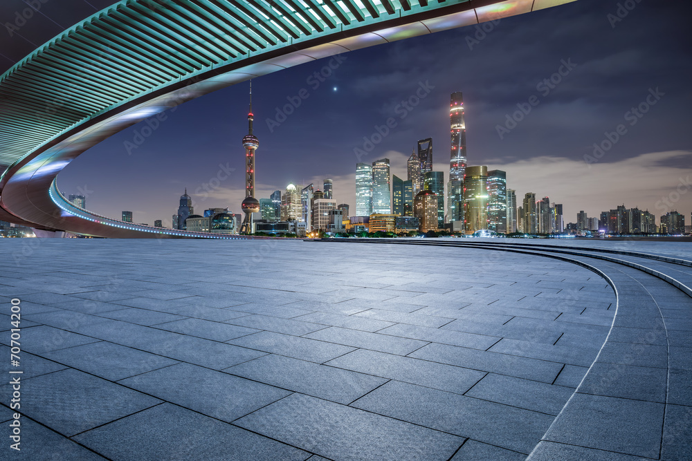 Empty square floor and bridge with modern city buildings scenery at night in Shanghai