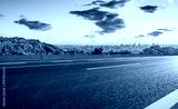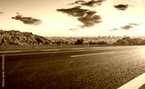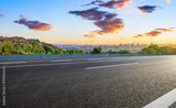 Asphalt road and green mountains with city skyline landscape at sunrise. high angle view.