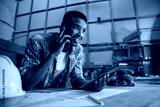 Smiling young African male uses cellphone while holding tablet in woodwork warehouse