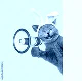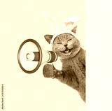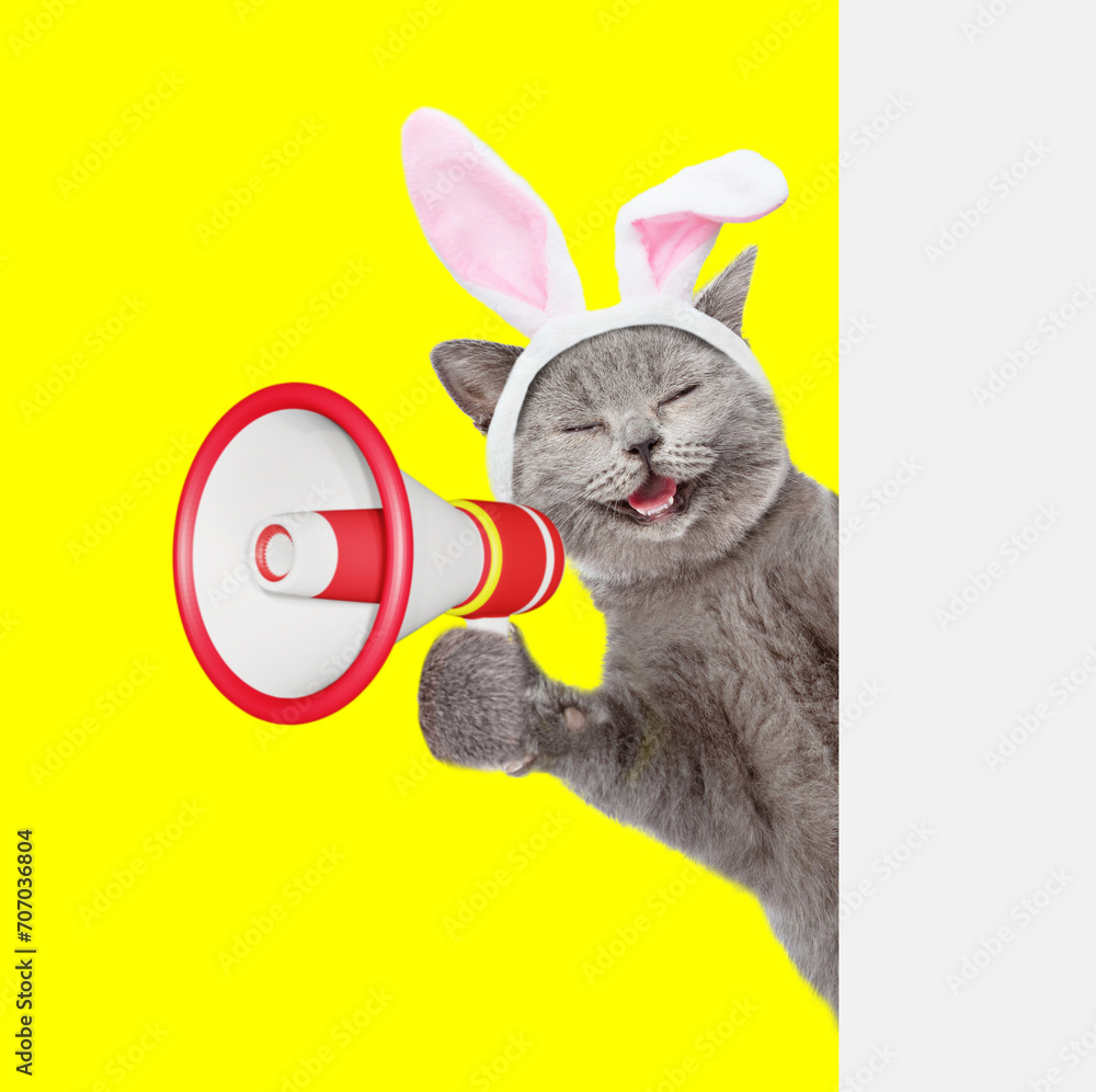 Happy kitten wearing easter rabbits ears screaming into a megaphone and looking from behind empty whie banner. Isolated on yellow background