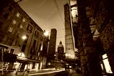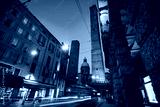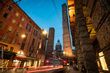 Two famous falling Bologna towers Asinelli and Garisenda. Evening view, long exposure. Bologna, Emilia-Romagna, Italy.