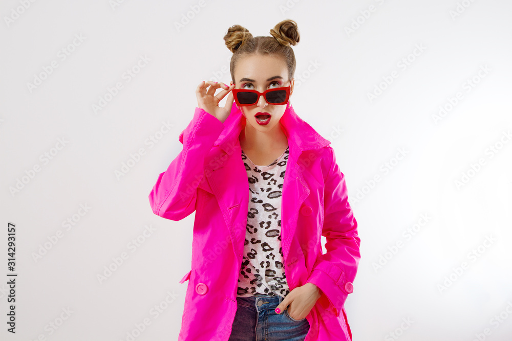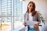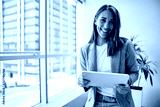 Young happy businesswoman working on digital tablet in office and looking at camera.