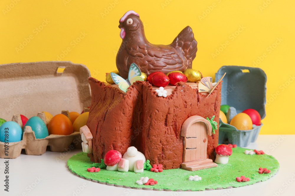 Easter log cake with textured look on the tree trunk and Easter bunny