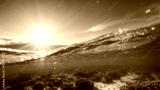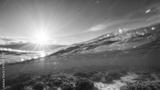 Underwater view of sea water surface with sun rays and blue sky. High quality photo