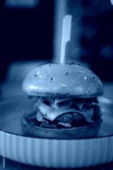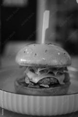 Delicious cheeseburger with pork and vegetables in bun in bowl