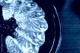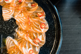 Slice thinly raw salmon pour it with Thai style spicy sauce and decoration with chili and garlic on a black plate.