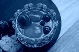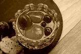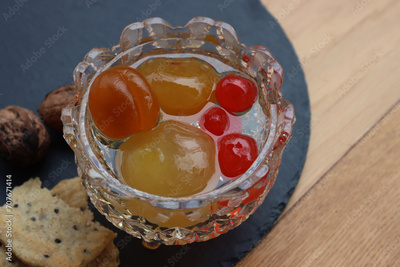 Italian Mostarda di Cremona with candied fruits in a glass bowl with snacks on a black slate stone plate on wooden table. Traditional Italian mustard