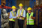 factory workers checking product list on clipboard and taking about work in the warehouse storage