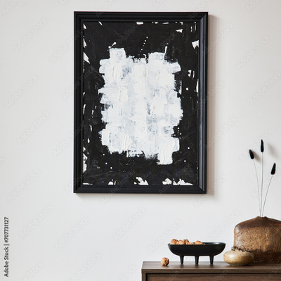 Stylish living room interior composition with mock up poster frame, brown wooden commode, armchair and small home decorations. White wall. Copy space. Template. .