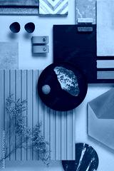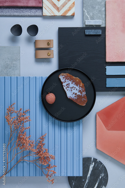 Creative flat lay composition of interior designer moodboard with textile and paint samples, blue lamella panels and tiles. Pink, black, blue and light grey color palette. Copy space. Template.