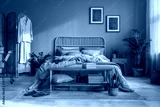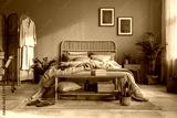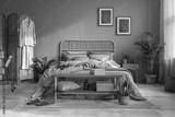 Stylish bedroom interior design with mock up poster frame, bamboo bed, night table, plants, folding screen and creative home accessories. Eucalyptus wall. Template. Copy space.