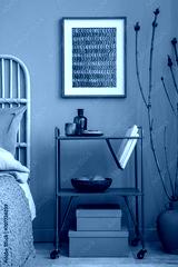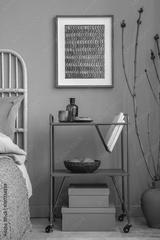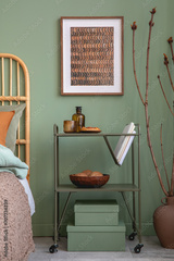 Stylish bedroom interior design with mock up poster frame, bamboo bed, metal shelf and creative home accessories. Eucalyptus wall. Home staging. Template. Copy space.