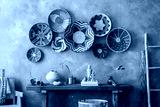 The stylish ethnic compostion at living room interior with wicker baskets, wooden bench, sofa and elegant personal accessories. Cozy apartment. Home decor. Template.