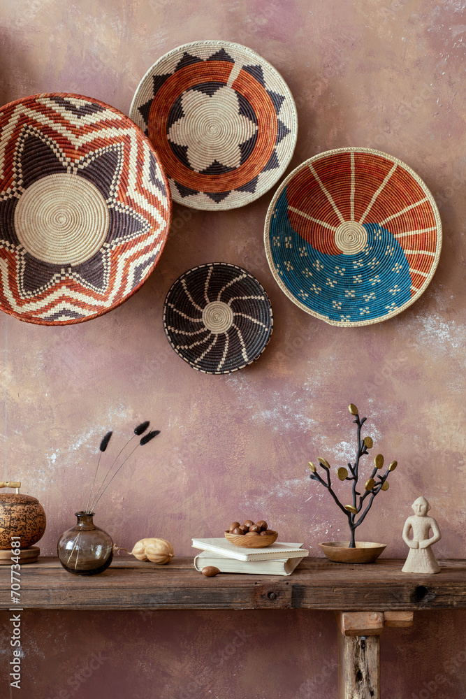 The stylish ethnic compostion at living room interior with wicker baskets, wooden bench, sofa and elegant personal accessories. Cozy apartment. Home decor. Template.