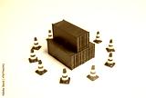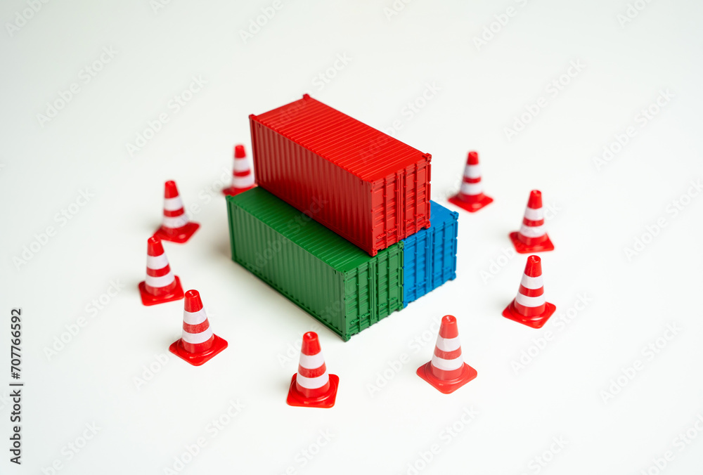 Seizure of cargo. Sea containers are surrounded by road cones and are inaccessible for transportation. Legal or logistical challenges hindering the movement of goods. Shipping complexities disruptions