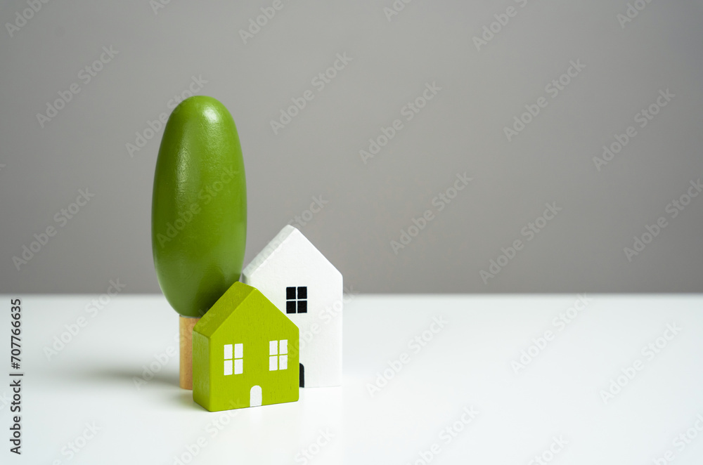 Houses and trees, space for text. Affordable housing. Buying a nice house. Garden work, landscape design. Figurine. Mortgage and loan.