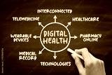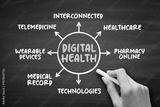 Digital health - digital care programs, technologies with health, healthcare, living, and society to enhance the efficiency of healthcare delivery, mind map concept for presentations and reports