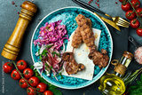 Baked lamb on a plate. Grilled lamb entrecote. Meat dishes.