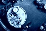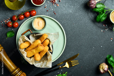 Deep-fried cheese sticks with burger sauce. Close up. on a plate On a black stone background.