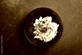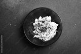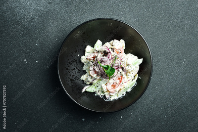 Salad of cabbage, tomatoes, onions and radish dressed with sour cream. On a plate. Restaurant serving. Close up. On a dark stone background.