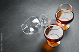 A glass with aged cognac or brandy on a dark table. Strong aged alcoholic drinks. On a concrete background.
