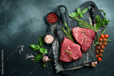 Juicy raw veal with steak spices on a stone background. Veal, meat. Top view.
