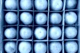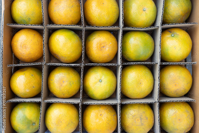 Fresh orange fruit is stacked in layers on the brown paper carton box. Thai agriculture products.