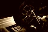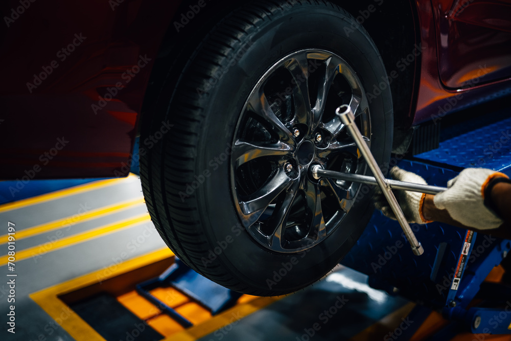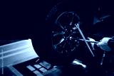 Mechanic with repairing car wheel in workshop. Hands using screwdriver to change the tyre of car.
