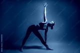A young slim attractive girl demonstrates yoga poses in the studio on a beige background.