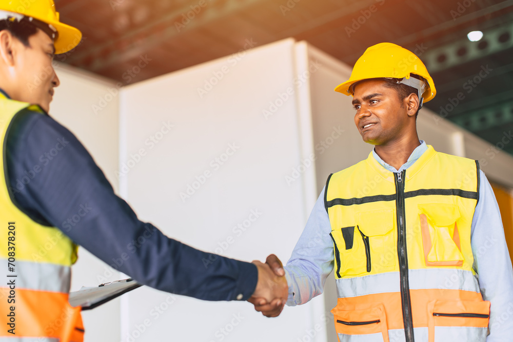 closeup indian engineer male factory manager meeting shaking hand deal project with partnership
