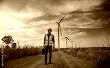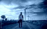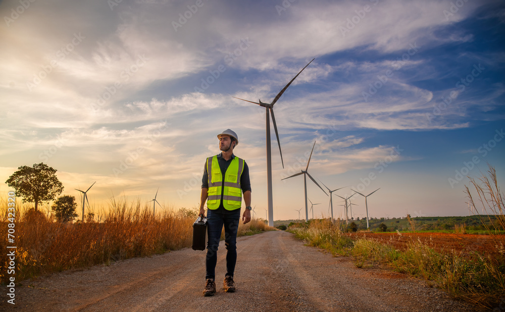Engineer wearing uniform ,helmet hold document inspection work in wind turbine farms rotation to generate electricity energy. Green ecological power energy generation wind sustainable energy concept.