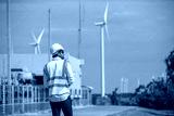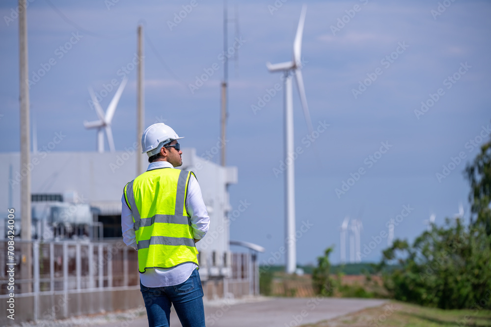 Engineer wearing uniform ,helmet hold document inspection work in wind turbine farms rotation to generate electricity energy. Green ecological power energy generation wind sustainable energy concept.