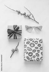 Gift boxes with red bow, lipstick kisses and quince flowers with heart shaped sunglasses on the white background. Valentine's day concept card.