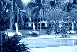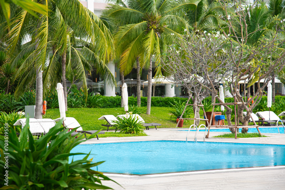Upscale modern multistory resort hotel building with outdoor swimming pool complex, surrounding lush green coconut palm trees tropical garden, lounger chairs white cushion, Nha Trang, Vietnam