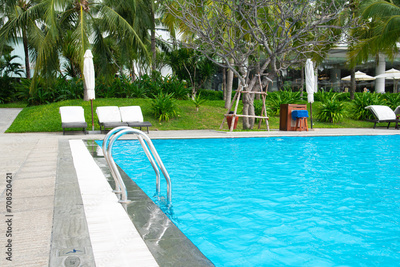 Pool handrail at upscale resort with row of lounger chairs white cushion, collapsed beach umbrella, round stool table, surrounding by coconut palm trees, tropical garden in Nha Trang, Vietnam