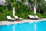 Coconut palm trees and tropical garden surrounding swimming pool at upscale resort with row of lounger chairs white cushion, collapsed beach umbrella, round stool table, Nha Trang, Vietnam