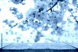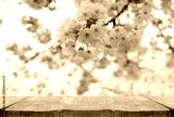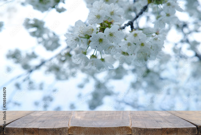 floral spring abstract nature panorama background with wooden base, apple tree Blossoms and Essence Spring, pink flowers, blooming branches against backdrop of blue sky, concept springtime landscape