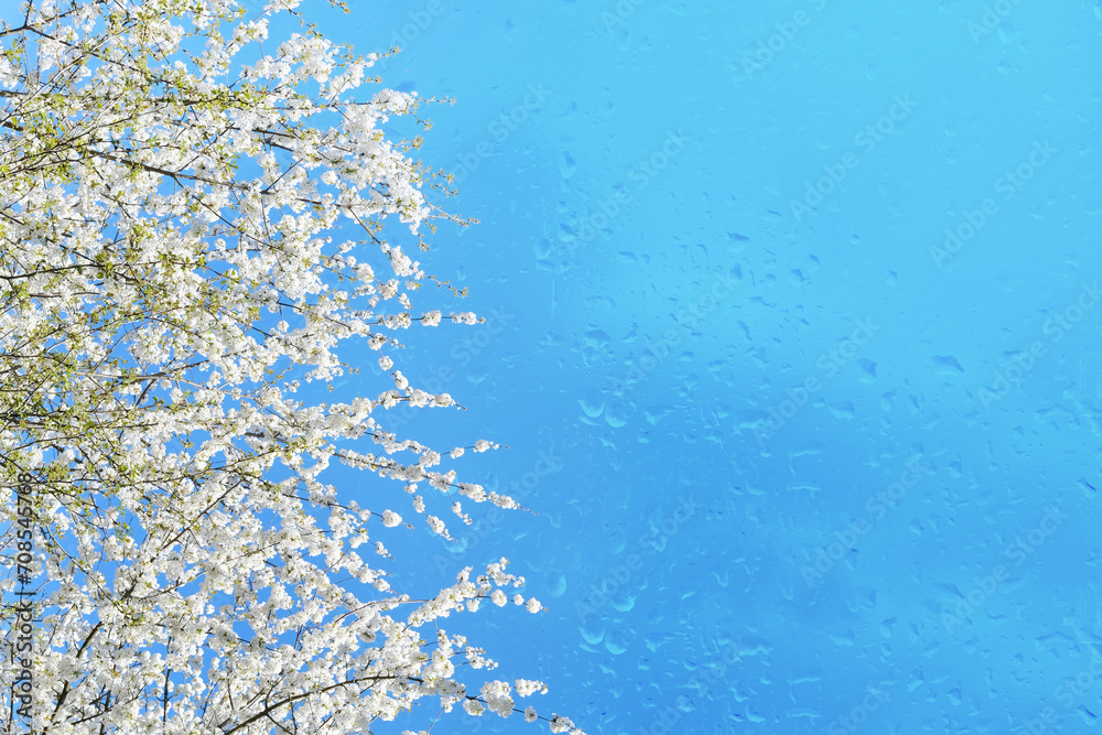 blooming branches white blossoms, against backdrop of blue sky, concept spring season, Spring Celebrations, environmental, nature in detail